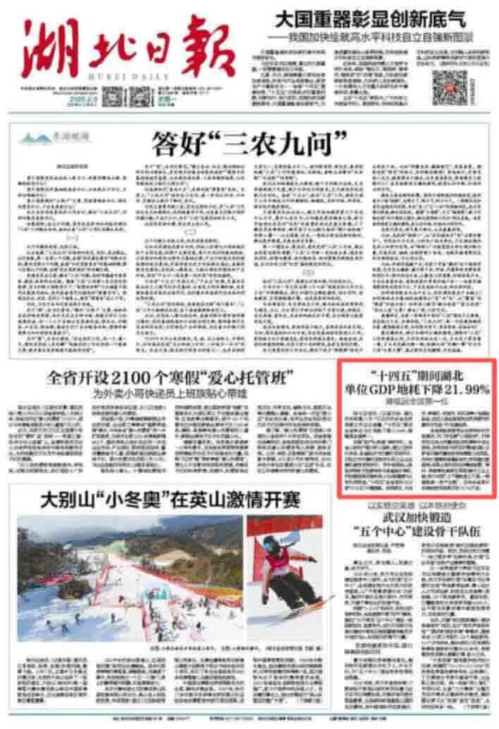 2月9日,《湖北日报》头版聚焦2026年湖北省自然资源工作会议,专题报道“十四五”期间湖北单位gdp地耗下降21.99%,降幅居全国第一位。
