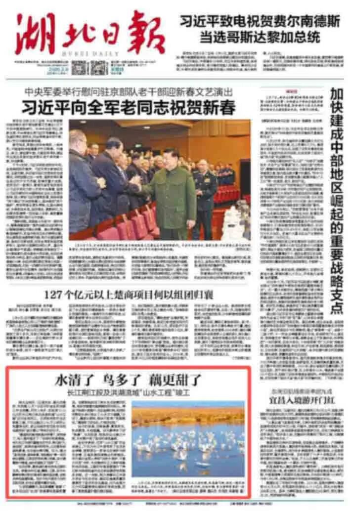 《湖北日报》头版聚焦:水清了 鸟多了 藕更甜了 长江荆江段及洪湖流域“山水工程”竣工