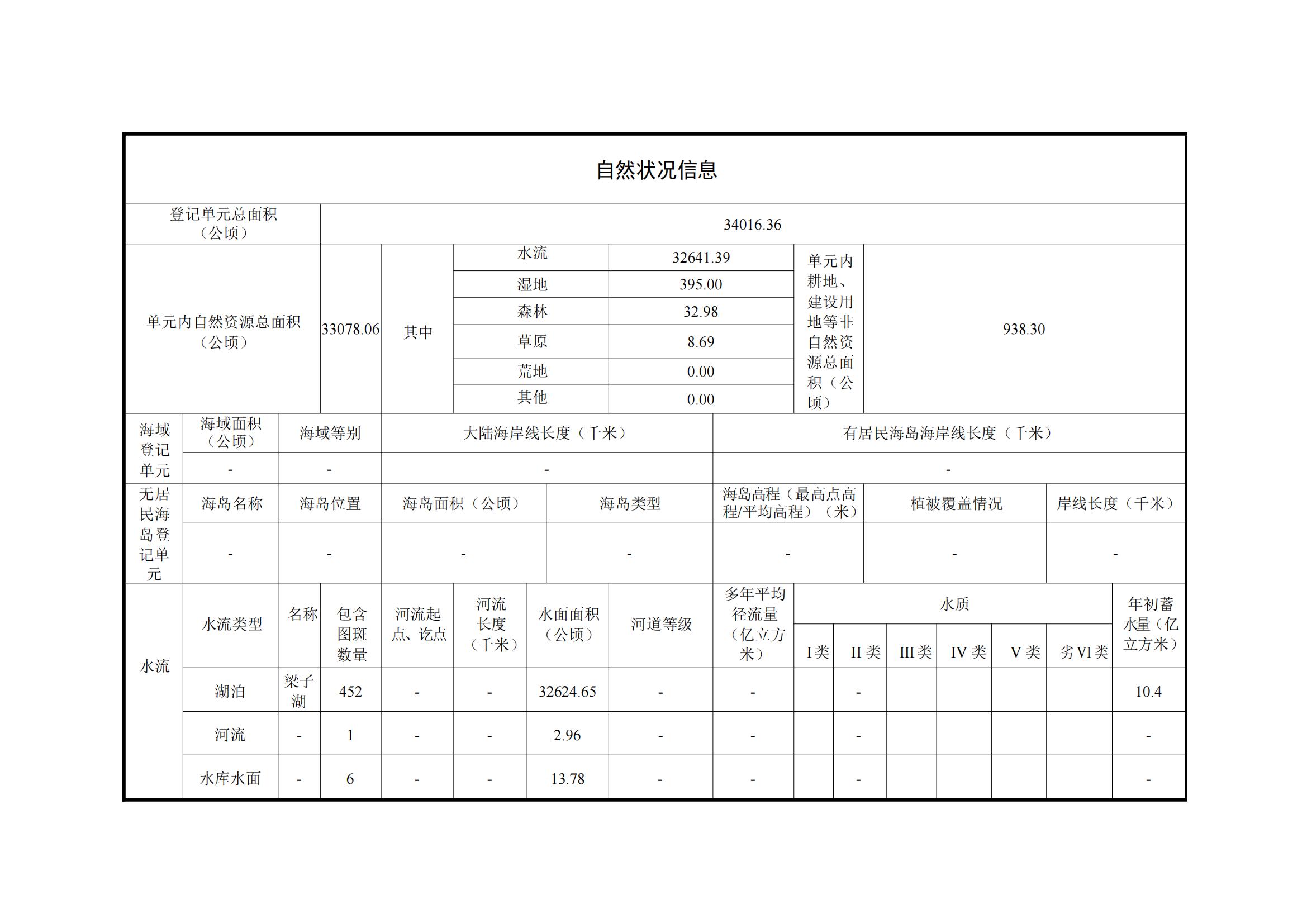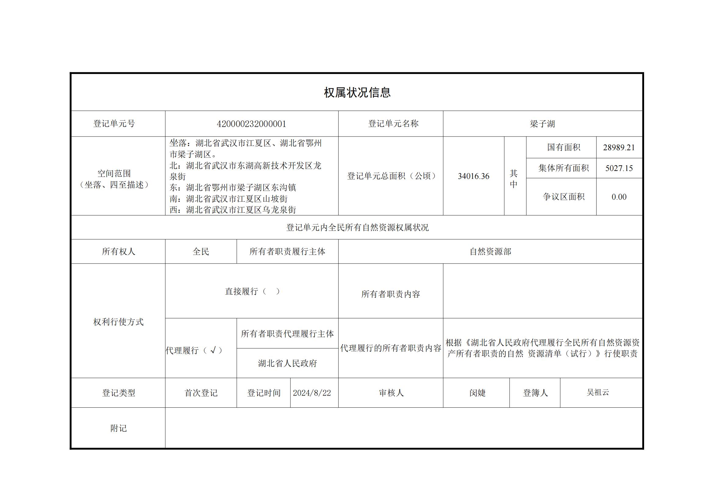 梁子湖自然资源登记单元已登簿,按照相关文件要求,现将登记信息公开发布。