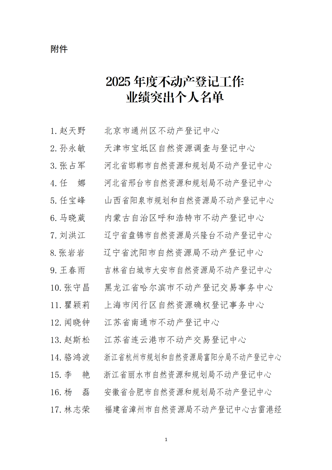 自然资源部办公厅关于通报表扬2025年度不动产登记工作业绩突出个人的函
