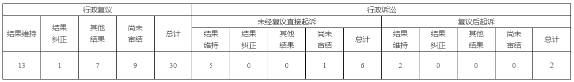 2024年,对厅信息公开不服的被复议案件30件,审结21件,其中:结果纠正1件,维持13件,其他结果7件,尚未审结9件;未经复议直接起诉6件,审结5件;其中:维持5件,尚未审结1件;经复议后起诉2件,审结2件,其中:维持2件。