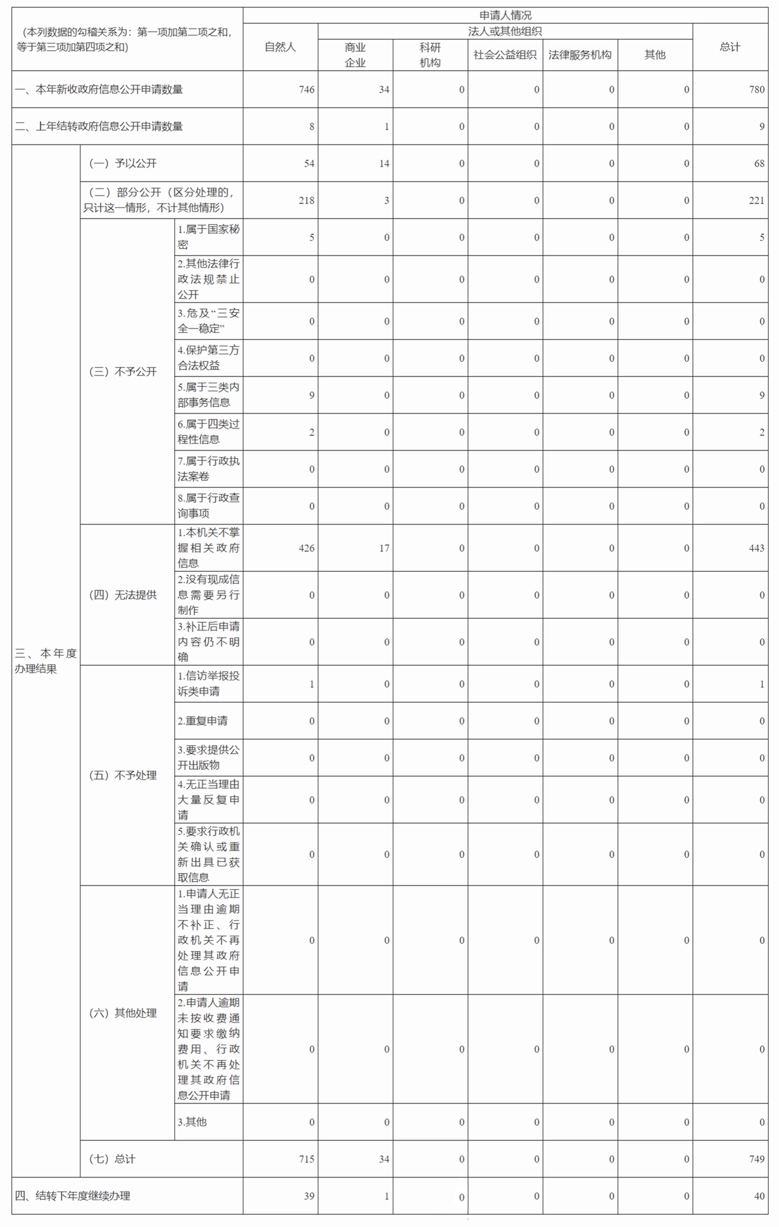 2024年,我厅共受理政府信息依申请公开780件,本年度共办结749件(其中2023年度结转9件),剩余40件结转至2025年度继续办理。